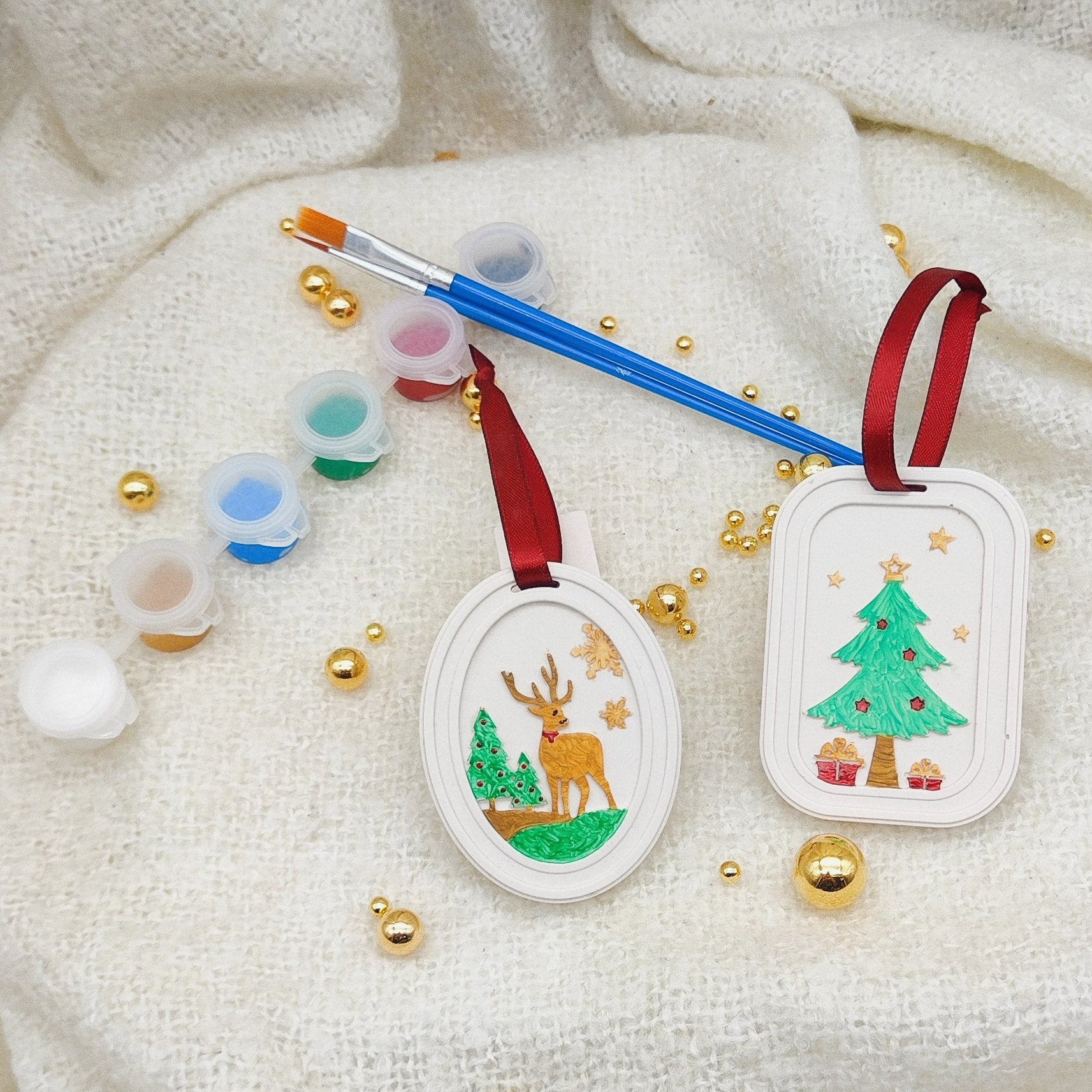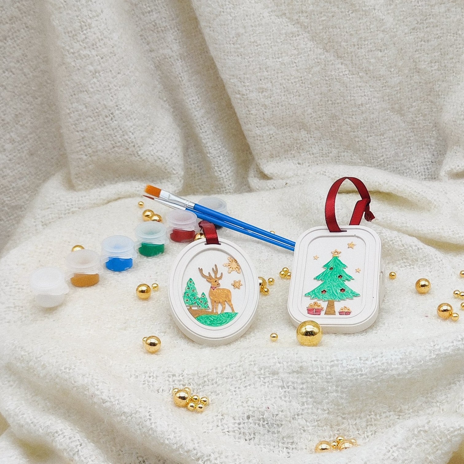 Um kit criativo que inclui dois pendentes feitos à mão com resina ecológica para pintar, tintas vibrantes, dois pincéis e uma prática paleta.