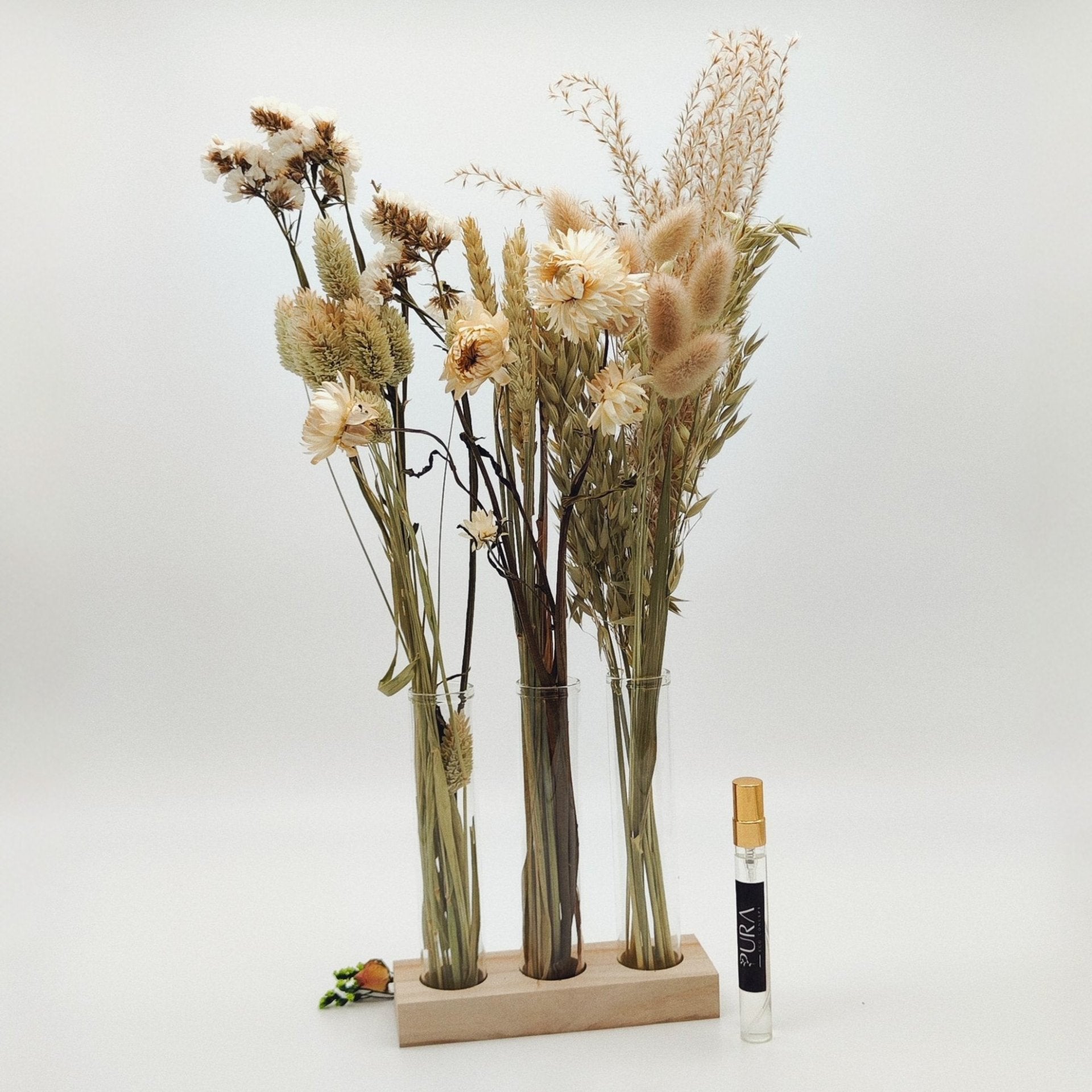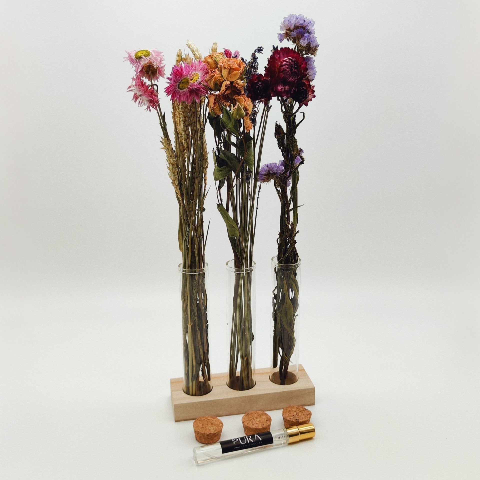 Cada caixa vem com um conjunto de flores secas selecionadas à mão e provenientes de agricultura biológica e com uma fragrância especial para flores secas, com um aroma floral delicado, capaz de transformar qualquer ambiente. Esta versão inclui, ainda, três tubos de vidro com suporte, perfeitos para criar pequenas jarras personalizadas e exibir as flores com estilo.