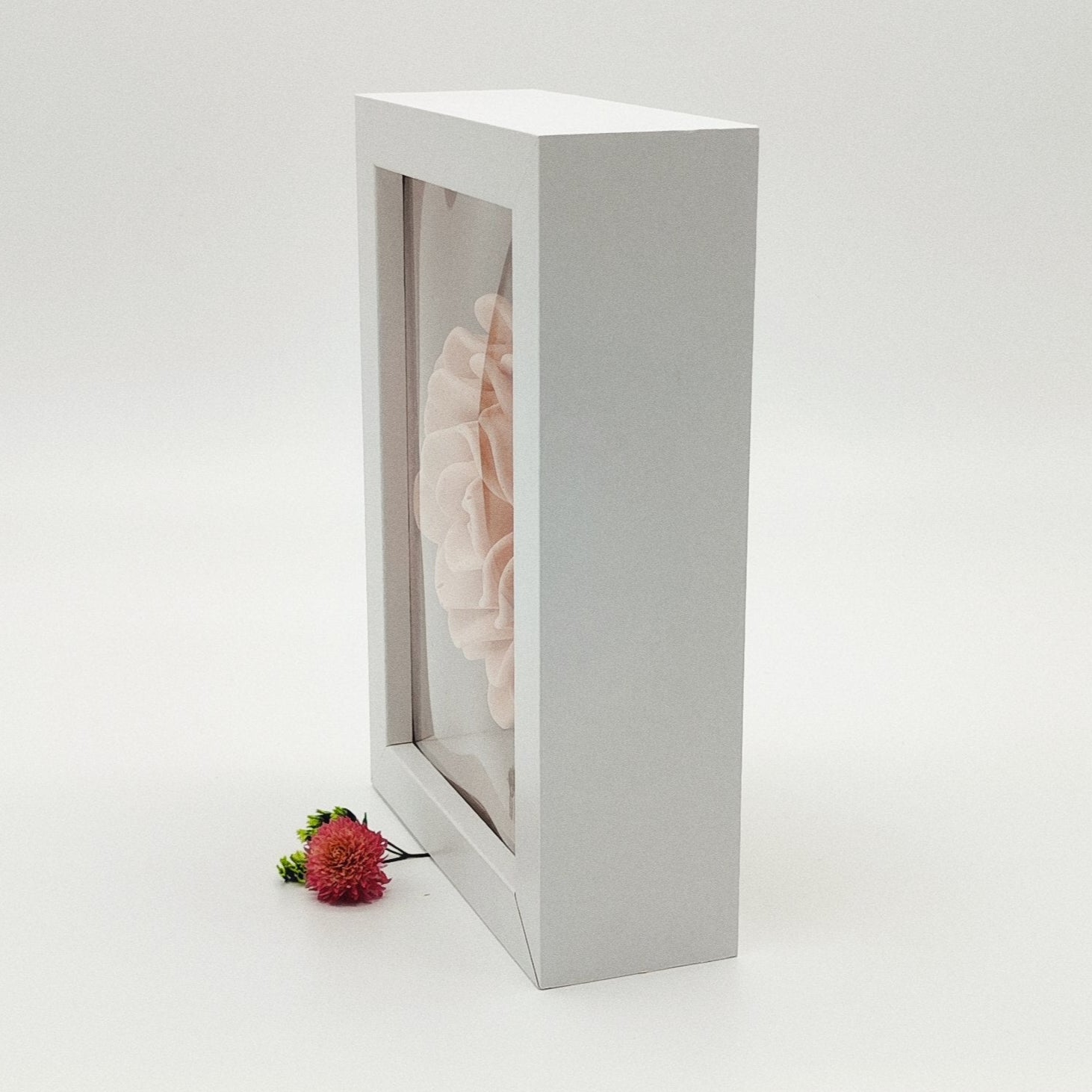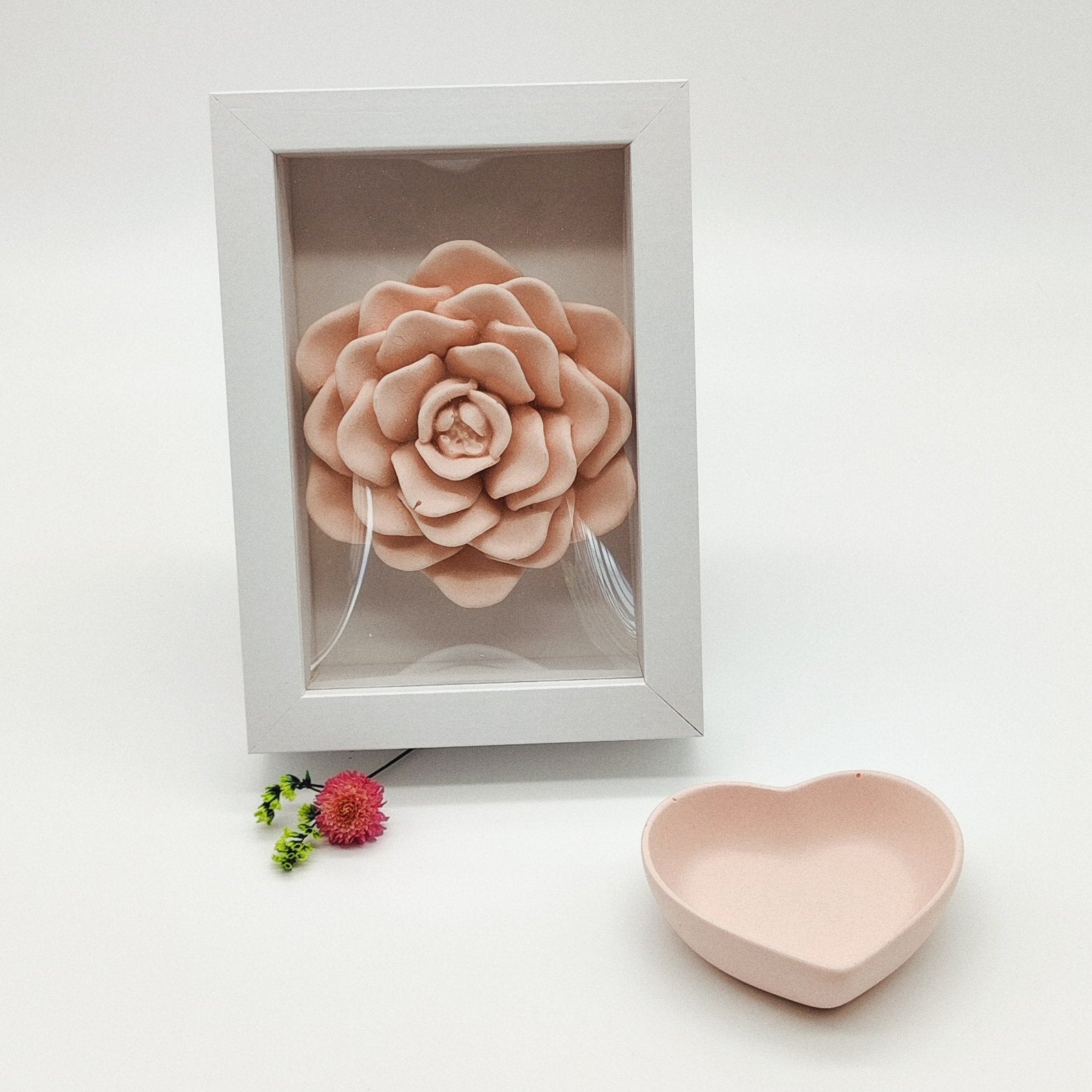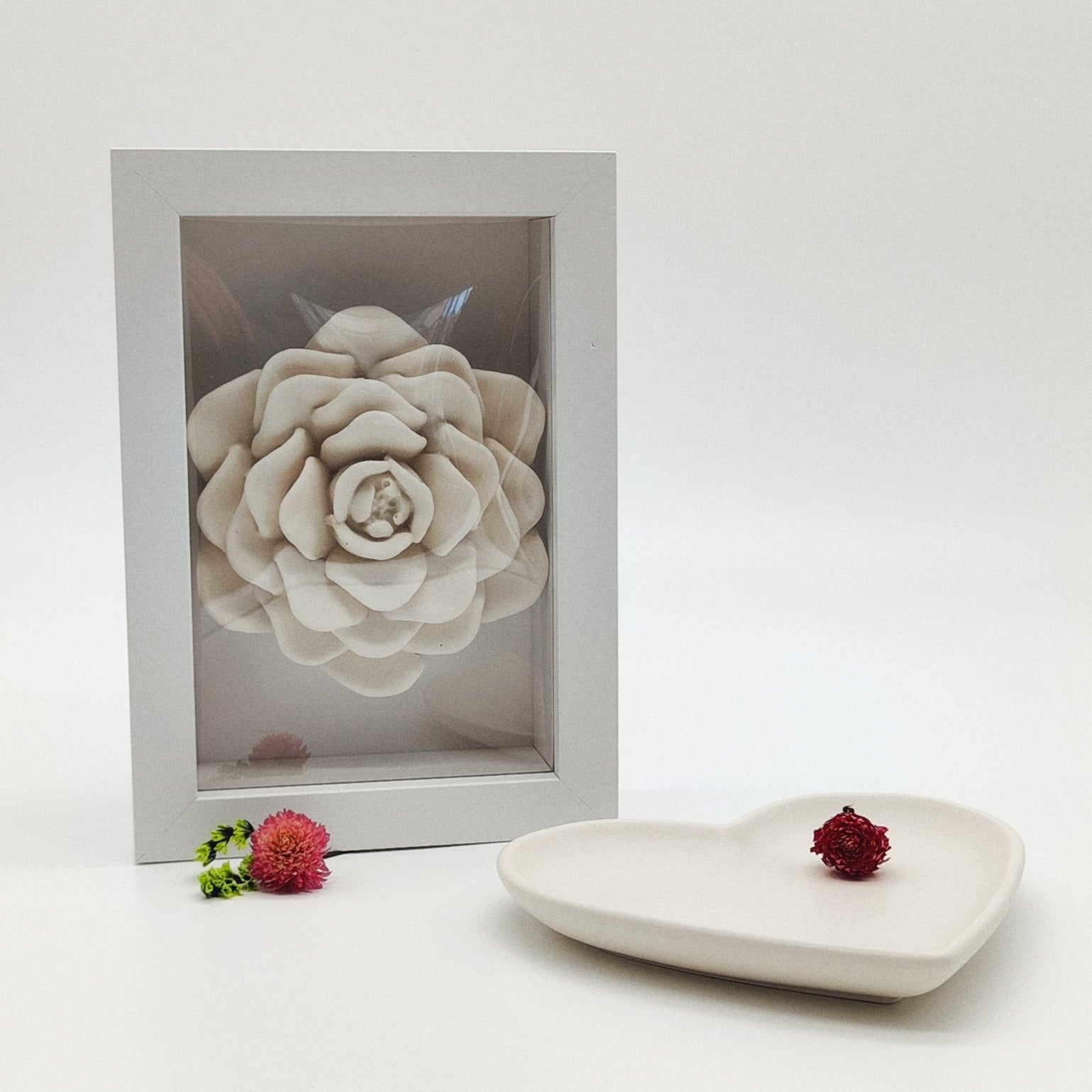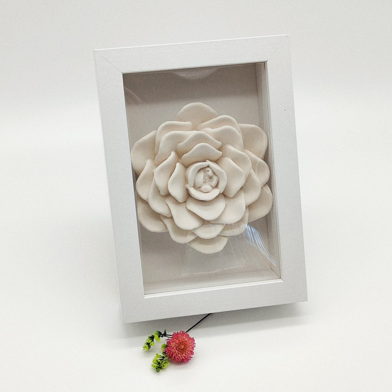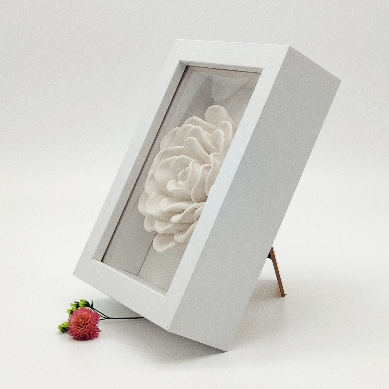 Moldura elegante, com uma flor feita à mão em resina ecológica. Uma peça elegante, intemporal e facilmente adaptável a vários estilos decorativos.