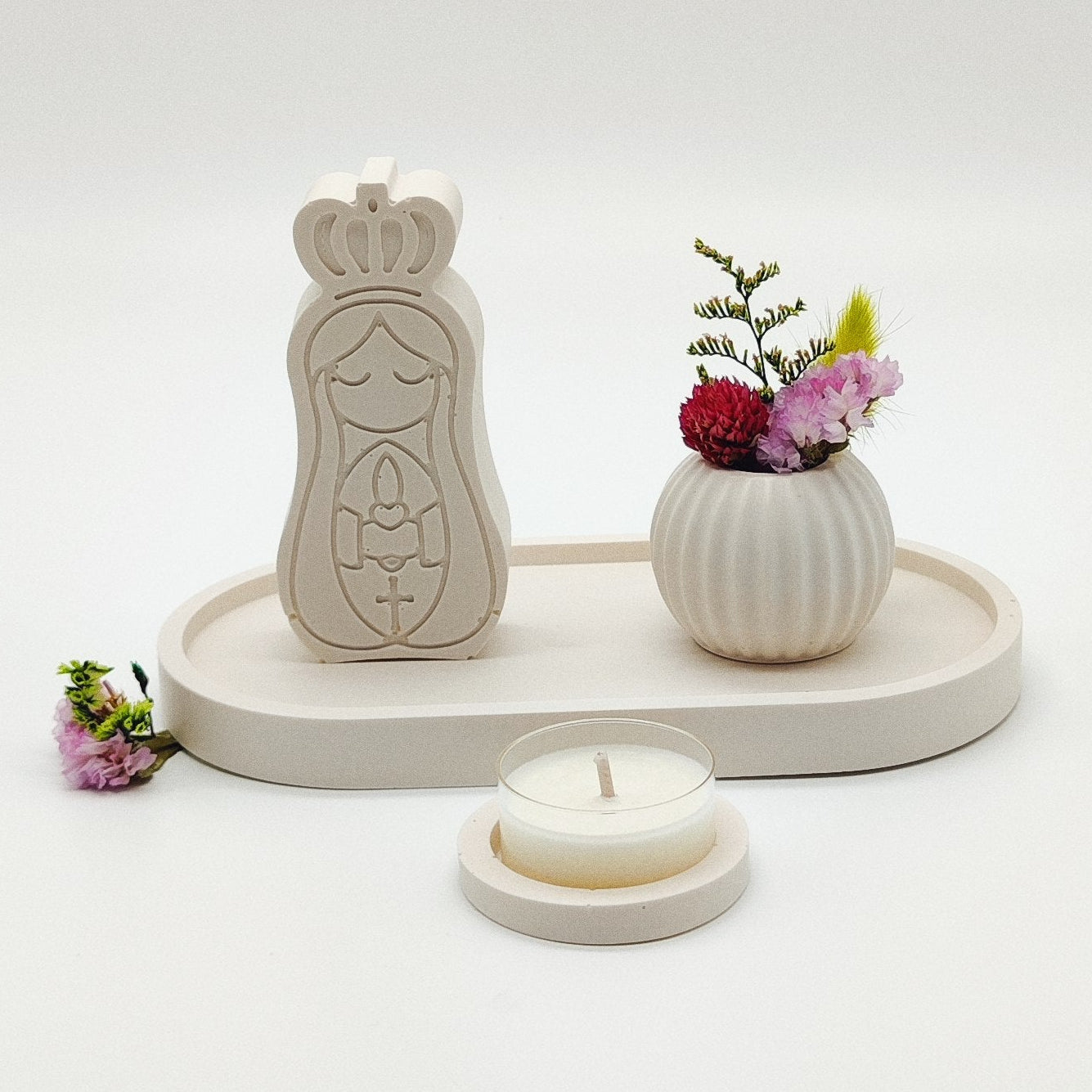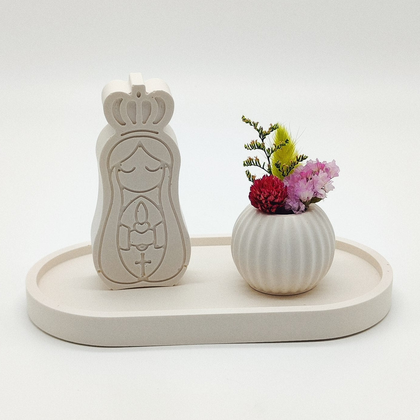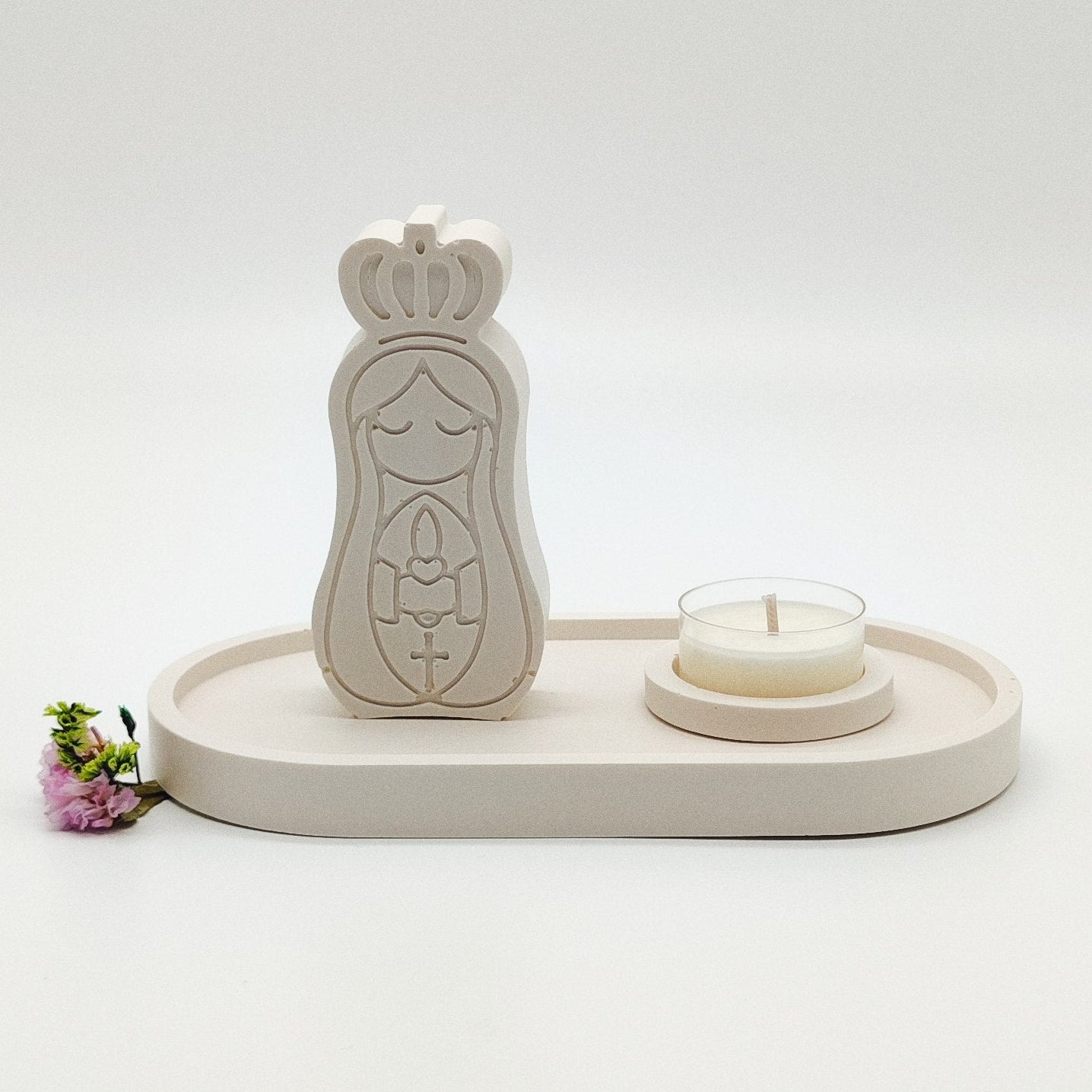 Com um design estilizado e delicadamente inspirado na simbologia de Maria, esta peça foi pensada para transformar o ambiente com suavidade e presença. Versátil por natureza, pode ser usada de duas formas: como um porta-velas acolhedor ou simplesmente como peça decorativa.