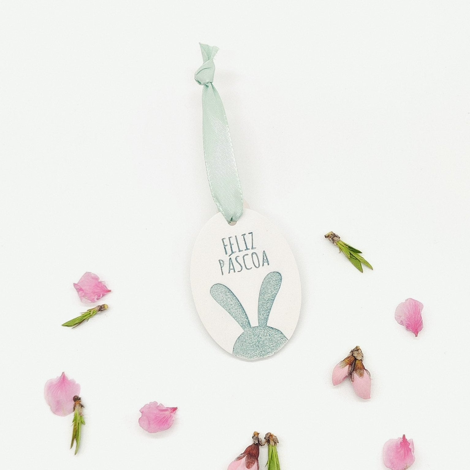 Pendente aromático (aroma talco floral) com a mensagem “Feliz Páscoa”.